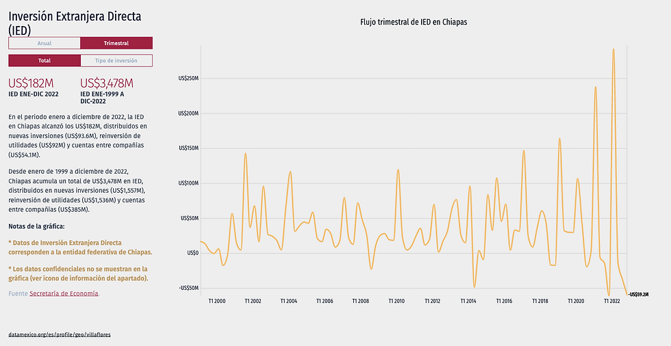 Desde enero de 1999 a diciembre de 2022, Chiapas acumula un total de US$3,478M en IED, distribuidos en nuevas inversiones (US$1,557M), reinversión de utilidades (US$1,536M) y cuentas entre compañías (US$385M).