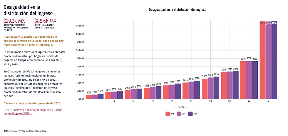 En Chiapas, el 10% de los hogares de menores ingresos (primer decil) tuvieron un ingreso promedio trimestral de $6.86k MX en 2020, mientras que el 10% de los hogares de mayores ingresos (décimo decil) tuvieron un ingreso promedio trimestral de $95.4k MX en el mismo periodo.
