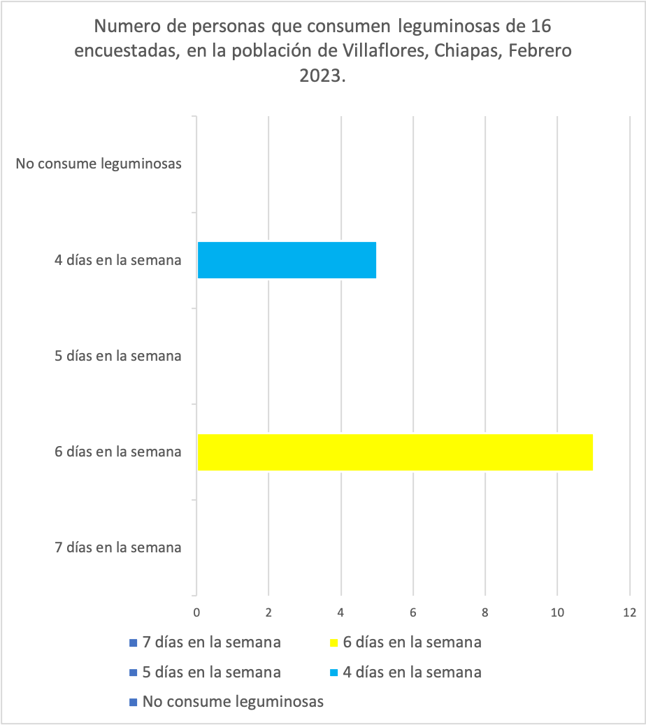 11 de 16 personas consume leguminosas durante 6 días durante la semana, 5 personas 4 días durante la semana.
